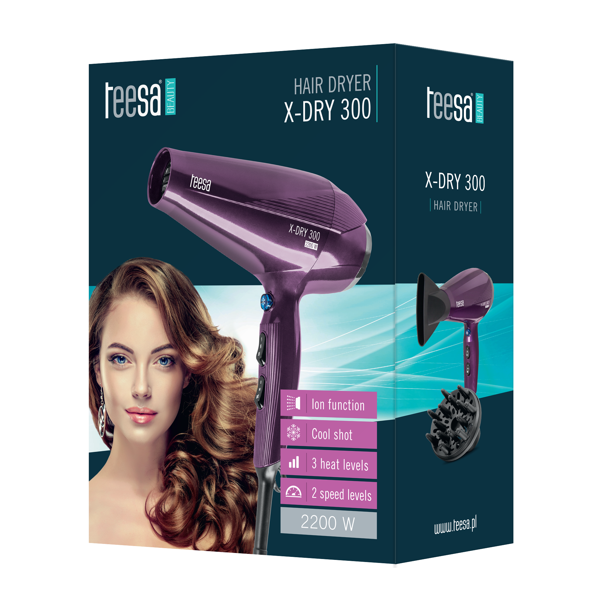 Suszarka Teesa X-DRY 300, to komfortowe w obsłudze urządzenie o dużej mocy do 2200 W, które umożliwia wysuszenie włosów szybko i efektywnie. Dzięki 3 poziomom temperatury i 2 prędkościom nawiewu, można dostosować pracę s
