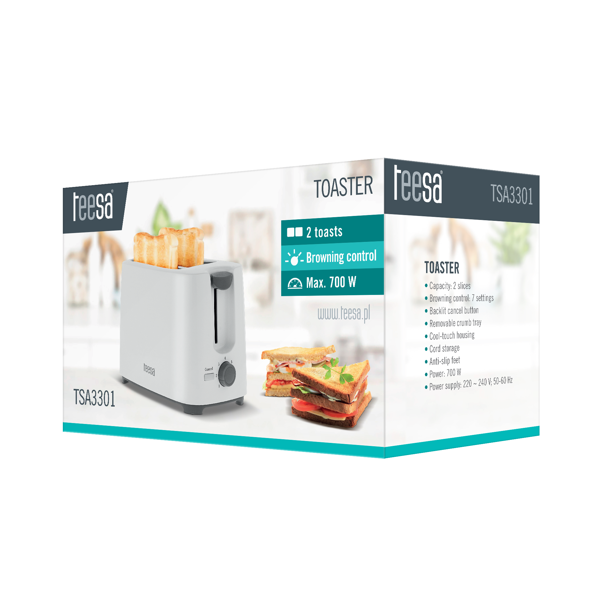 Toster Teesa TSA3301Chcesz przygotować przepyszne śniadanie dla całej rodziny? Z tosterem Teesa to nie problem! Urządzenie o mocy 700 W pozwala na jednoczesne przygotowywanie 2 tostów, co oznacza, że szybko i łatwo przygotujesz posiłek