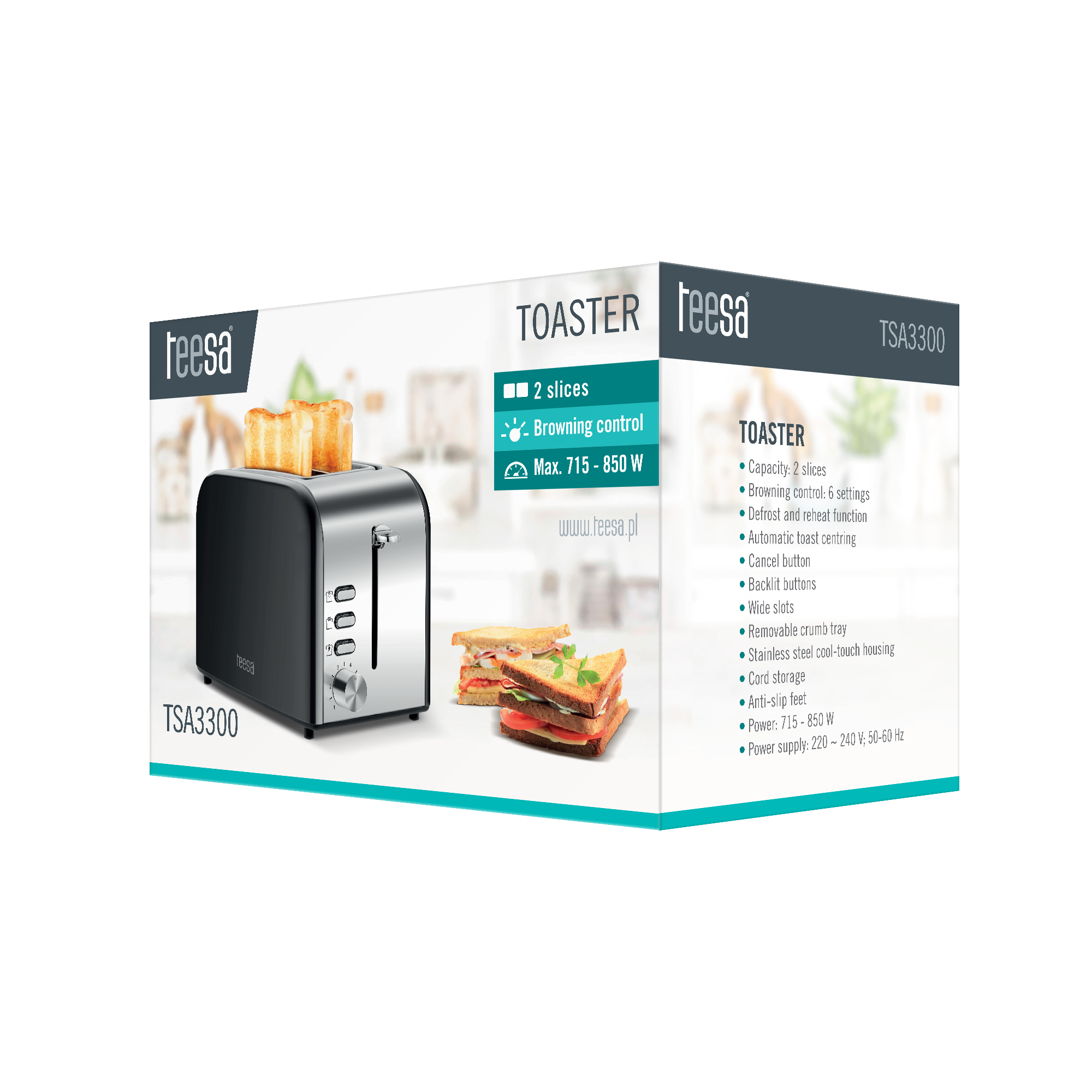 Toster Teesa TSA3300Masz czasem ochotę na urozmaicenie posiłków swojej rodziny? Toster Teesa w szybki i prosty sposób pomoże Ci przygotować pyszne tosty na wasze wspólne śniadania lub kolacje. Jego moc 850