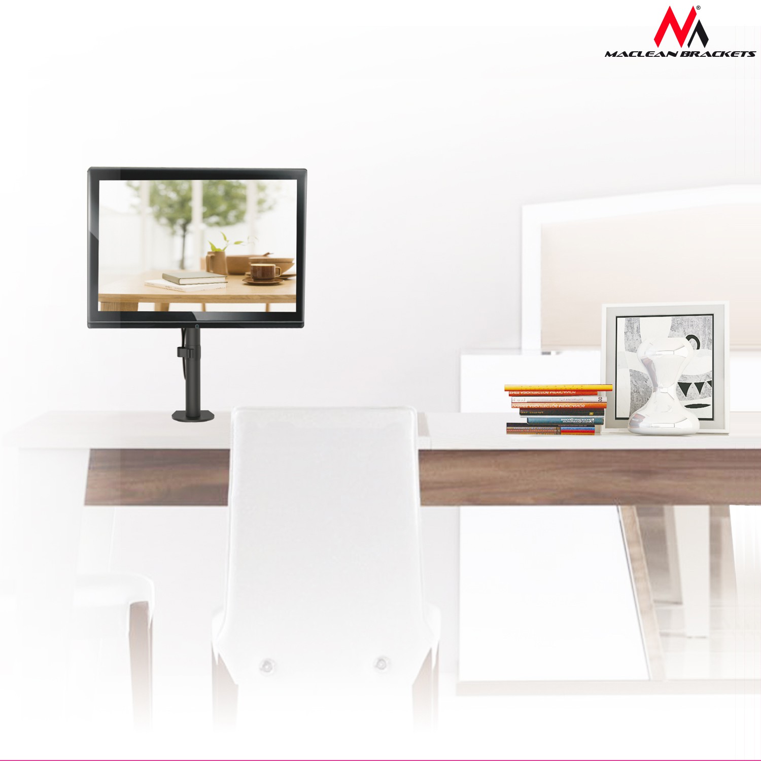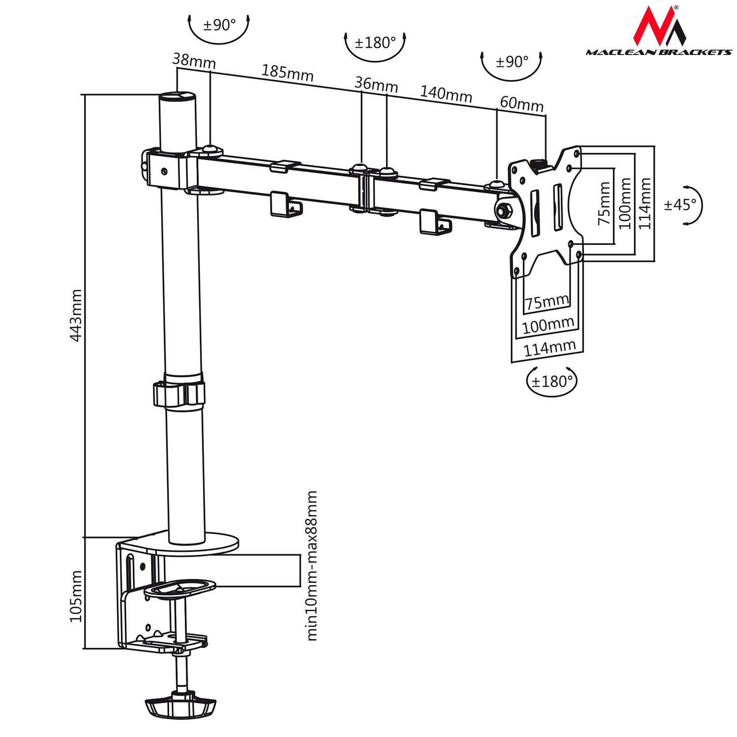 Uchwyt biurkowy do monitora LCD Maclean MC-753 13-32" 8kg vesa 75x75 oraz 100x100 podwójne ramię Uniwersalny uchwyt biurkowy na wysięgniku służy do montażu telewizorów LCD, LED oraz monitorów różnych marek o wadze do 8kg i o wymiarach przekątnej