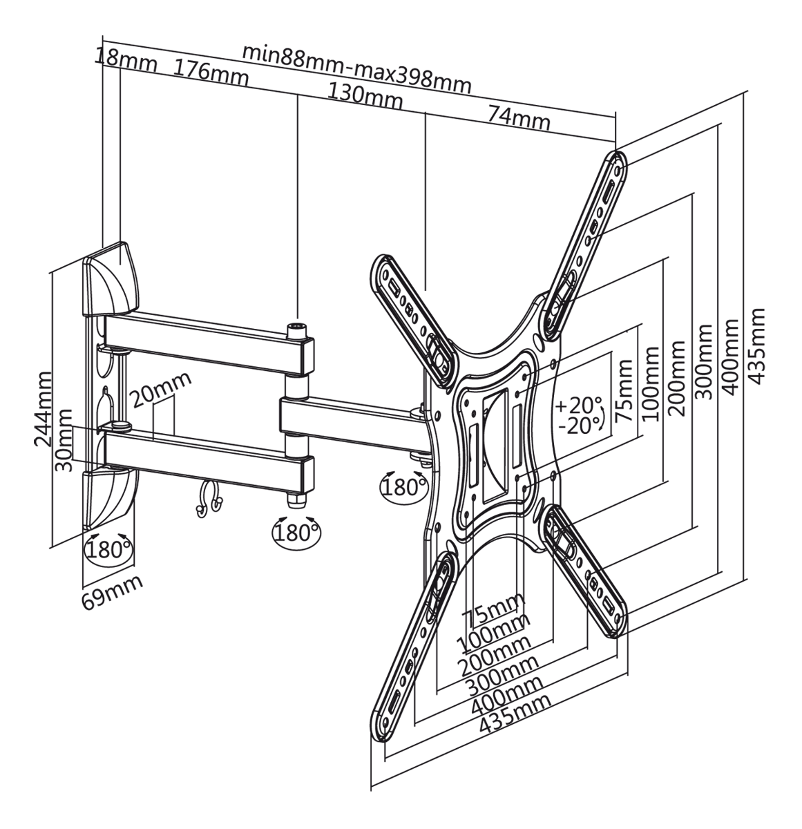 Przeznaczenie: Telewizory LCDMontaż: Do ścianyTyp uchwytu: RuchomyRozmiar ekranu: 23"-55"Maks. obciążenie: 30 kg (66 lbs)Standard VESA: 75x75, 100x100, 200x100, 200x200, 400x200, 300x300, 400x400Regulacja w pionie: +20°/ -20