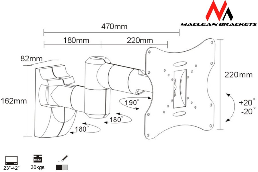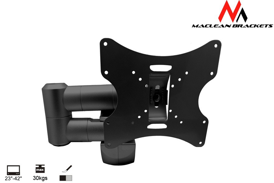 Opis produktu:Uniwersalny uchylny uchwyt ścienny Maclean MC-503A B jednoramienny do telewizorów LCD, LED oraz plazma o przekątnej ekranu od 23" do 42" i max. wadze do 30 kg. Uchwyt regulowany poziomo w dwóch płaszczyznach i w pionie w jedne