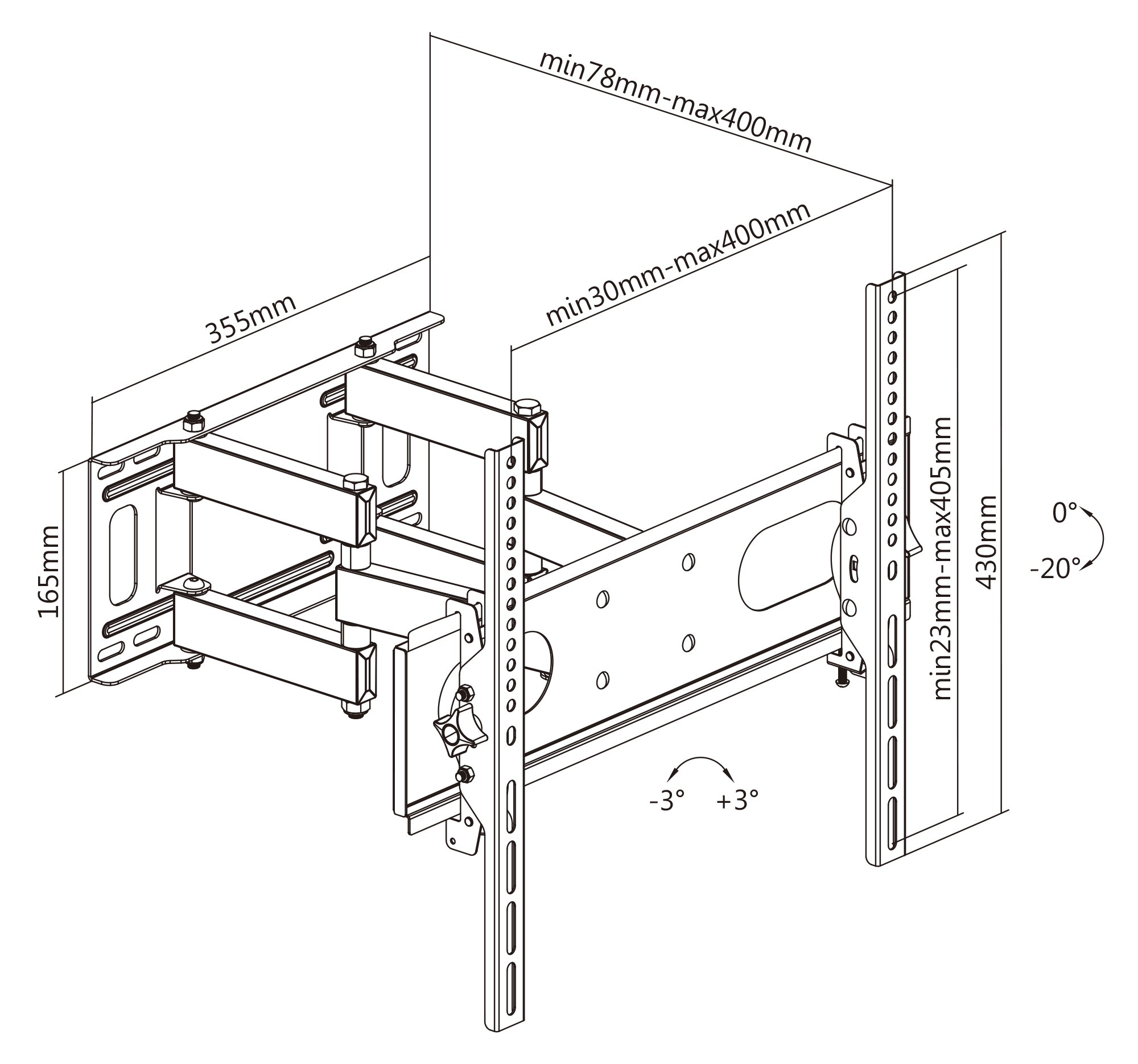 Rozmiar ekranu: 32"-55"Maks. obciążenie: 35 kg / 77 lbs VESA: 75x75, 100x100, 100x150, 150x100, 150x150, 200x100, 100x200, 200x200, 300x200, 300x300, 400x200, 400x300, 400x400Regulacja nachylenia: 0° ~ -20°Wyrównanie w pozio