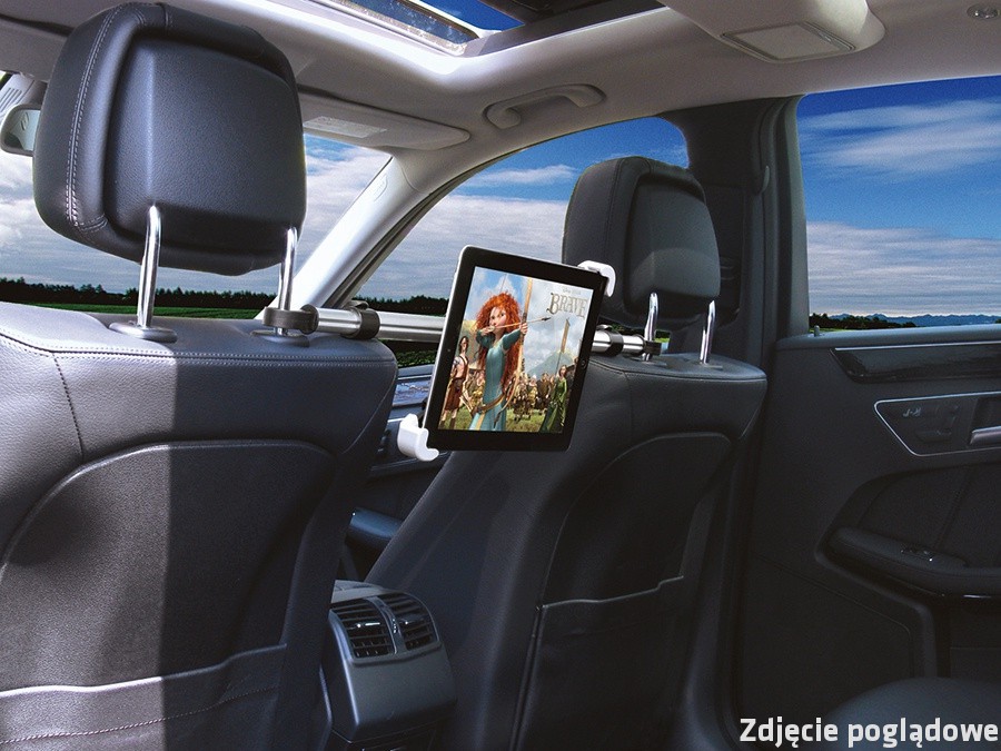 Opis produktu: Samochodowy uchwyt uniwersalny do tabletów montowany pomiędzy siedzeniami do wsporników zagłówka w fotelu kierowcy i pasażera. Regulowana długość ramienia pozwala na zamontowanie uchwytu praktycznie w każdym samochodzie.Szeroki zakres