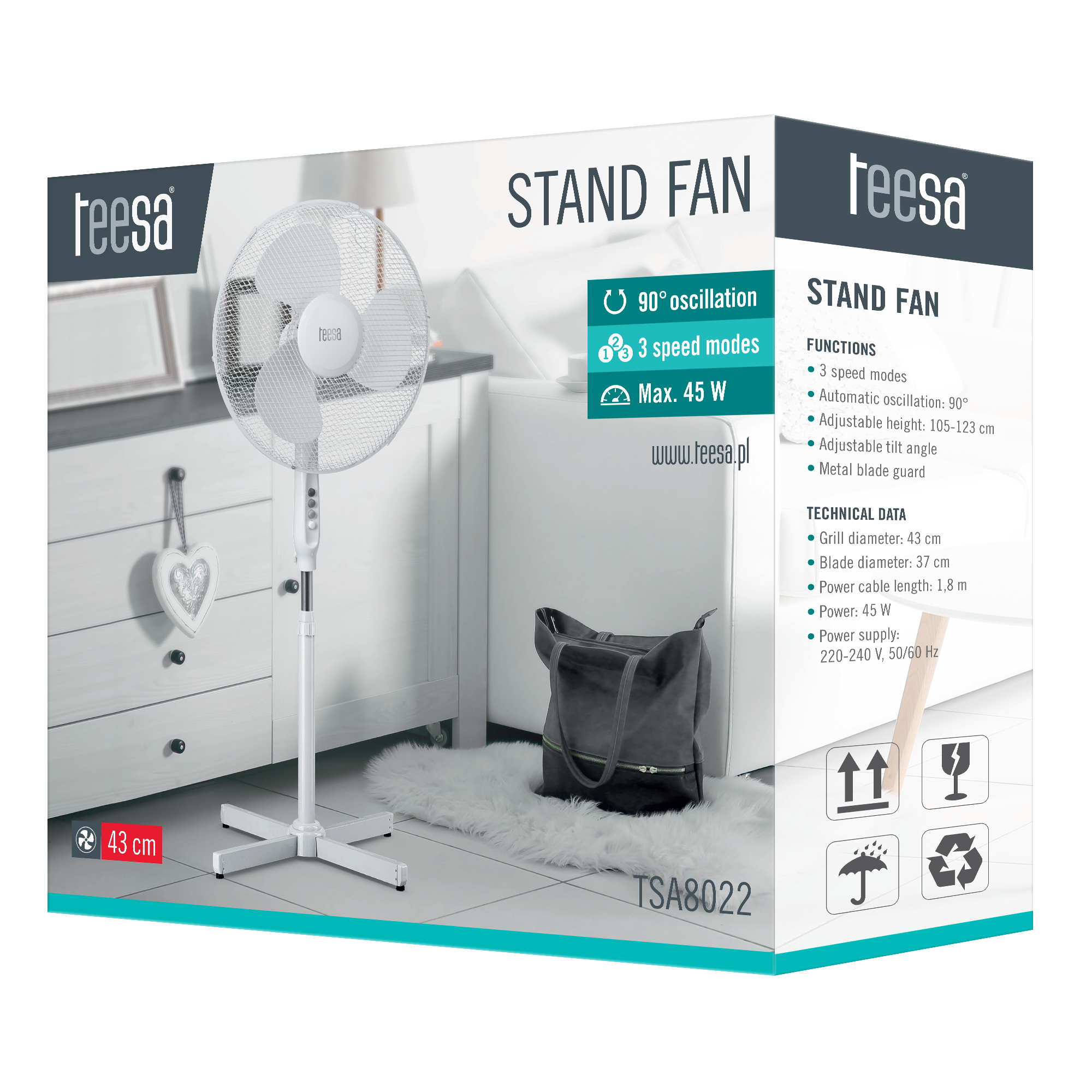 Wentylator stojący TEESAPOWIAŁO CHŁODEM! A to wszystko dzięki wentylatorowi stojącemu Teesa! Wybór jednego z trzech trybów prędkości gwarantuje, że dostosujesz temperaturę do swoich potrzeb. Duża średnica śmigieł, napędz