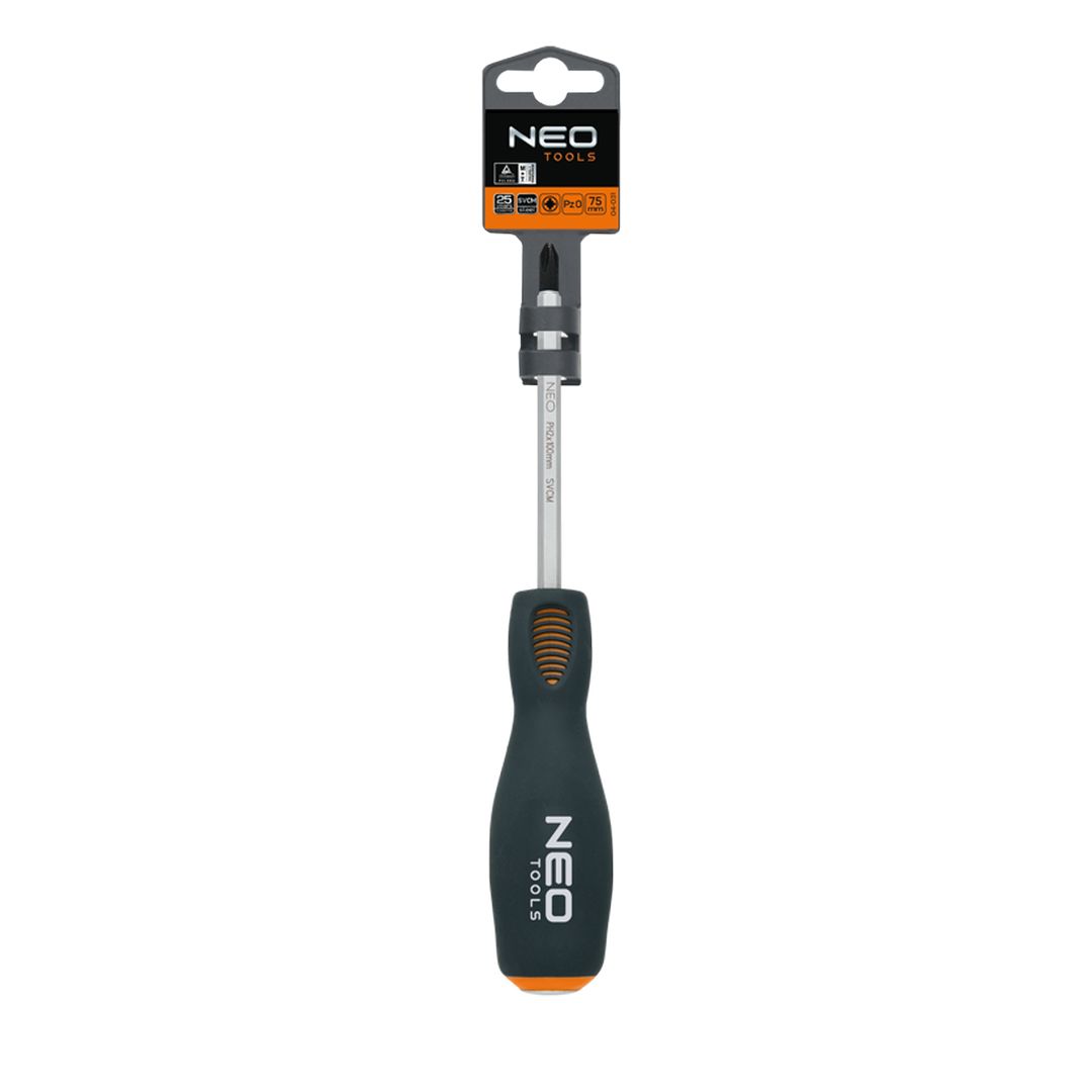 Wkrętak krzyżowy PZ1 x 100 mm, S2, twardość końcówki roboczej 56 HRc, magnetyczna końcówka, trójgraniasty kształt uchwytu, wyprofilowane oparcie dla kciuka, uchwyt pokryty tworzywem TPR odpornym na działanie chemikaliów, olejów mineralnych, smarów, T