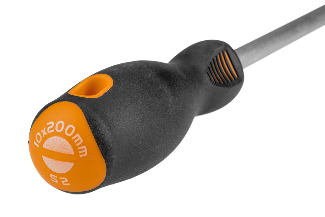 Wkrętak płaski 10.0 x 200 mm, S2, twardość końcówki roboczej 56 HRc, magnetyczna końcówka, trójgraniasty kształt uchwytu, wyprofilowane oparcie dla kciuka, uchwyt pokryty tworzywem TPR odpornym na działanie chemikaliów, olejów mineralnych, smarów, TÜ