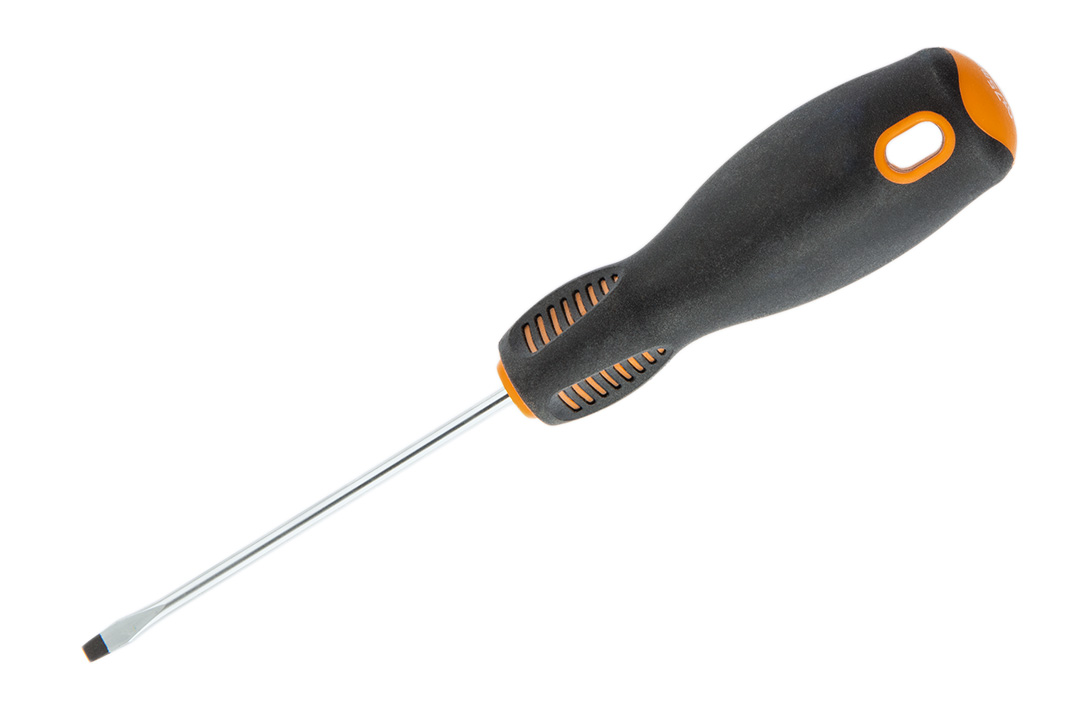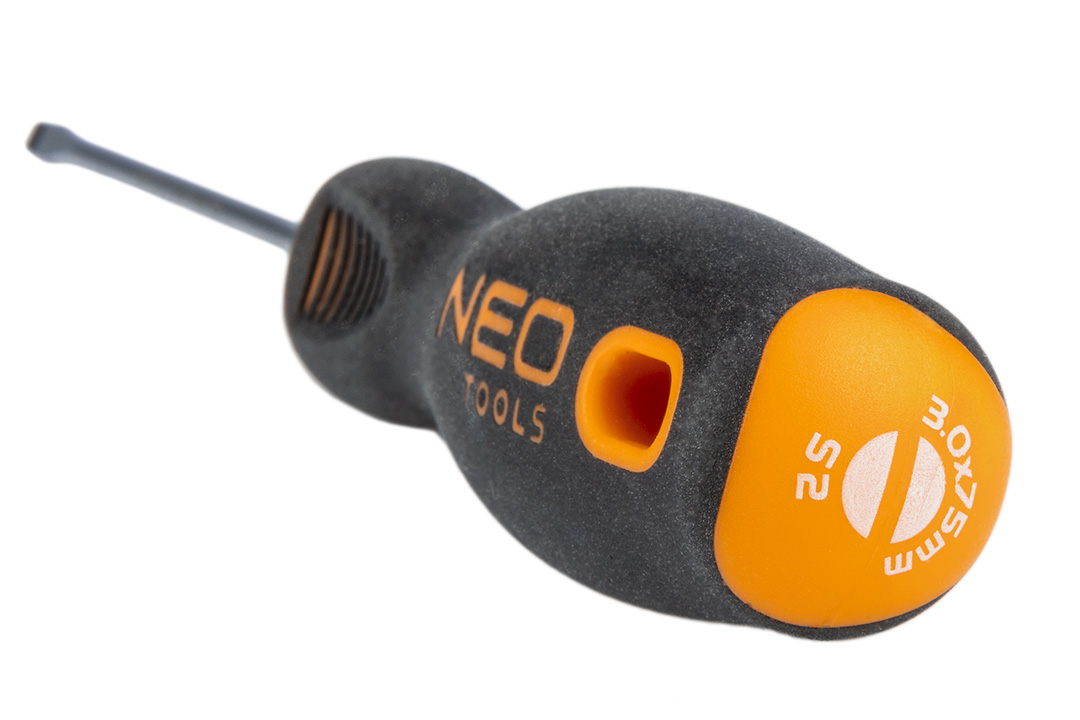 Wkrętak płaski 3.0 x 75 mm, S2, twardość końcówki roboczej 56HRc, magnetyczna końcówka, trójgraniasty kształt uchwytu, wyprofilowane oparcie dla kciuka, uchwyt pokryty tworzywem TPR odpornym na działanie chemikaliów, olejów mineralnych, smarów, certy