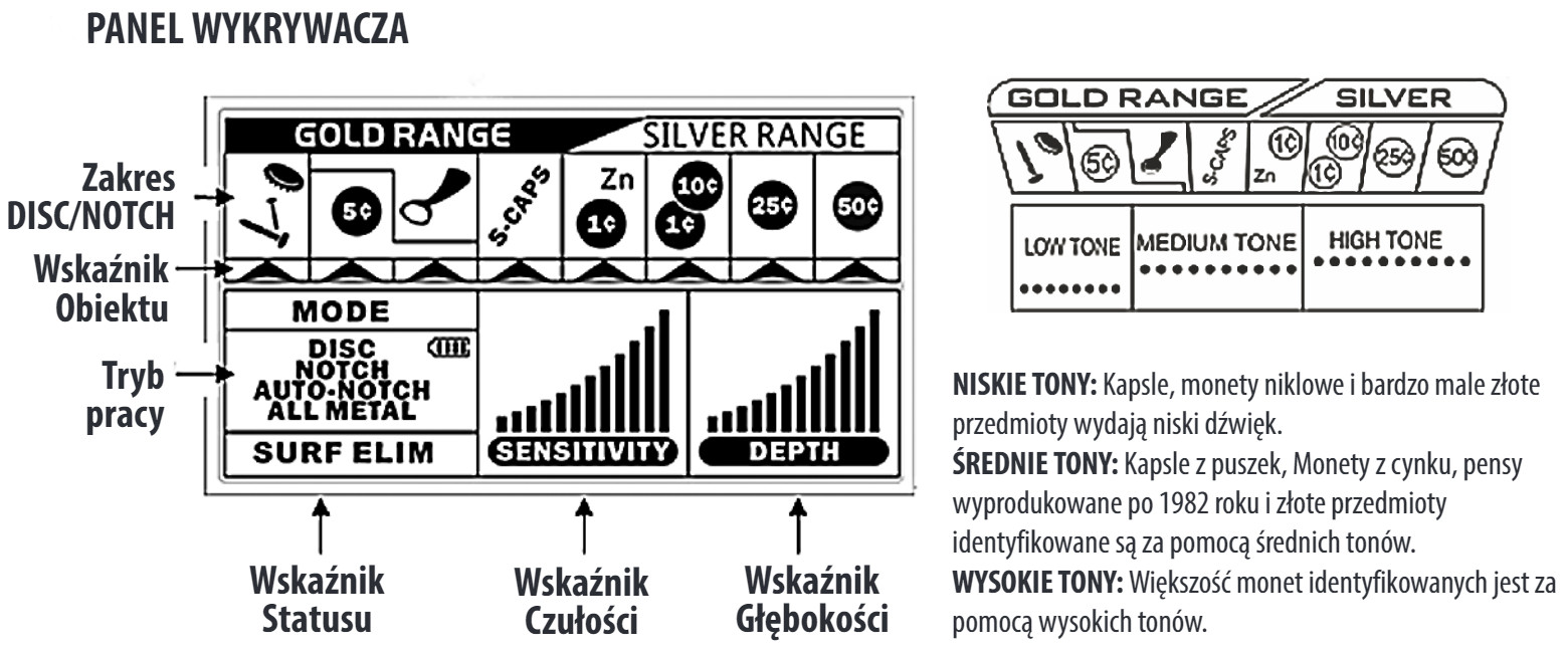 Opis produktu: Dostępne tryby pracy:ALL METAL - jest trybem pracy w spoczynku. W tym trybie metal jest wykrywany przez nieruchomą cewkę, a wykrywacz emituje stały sygnał. Nie ma potrzeby poruszania wykrywaczem z boku na bok. W trybie ALL METAL dostos
