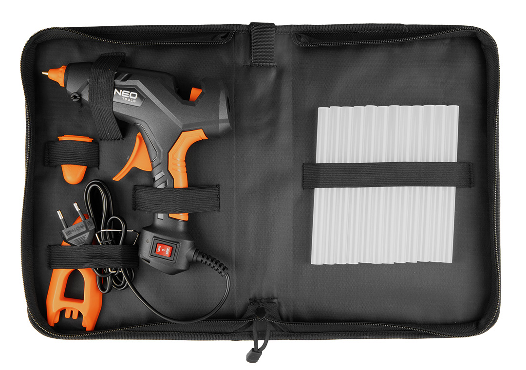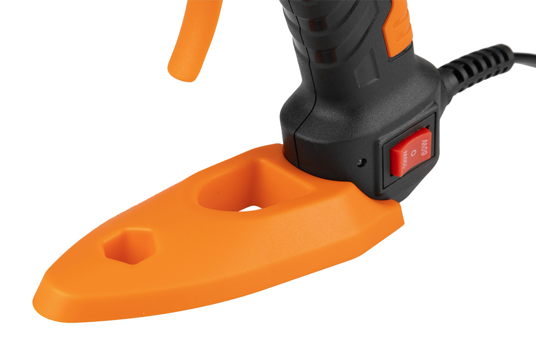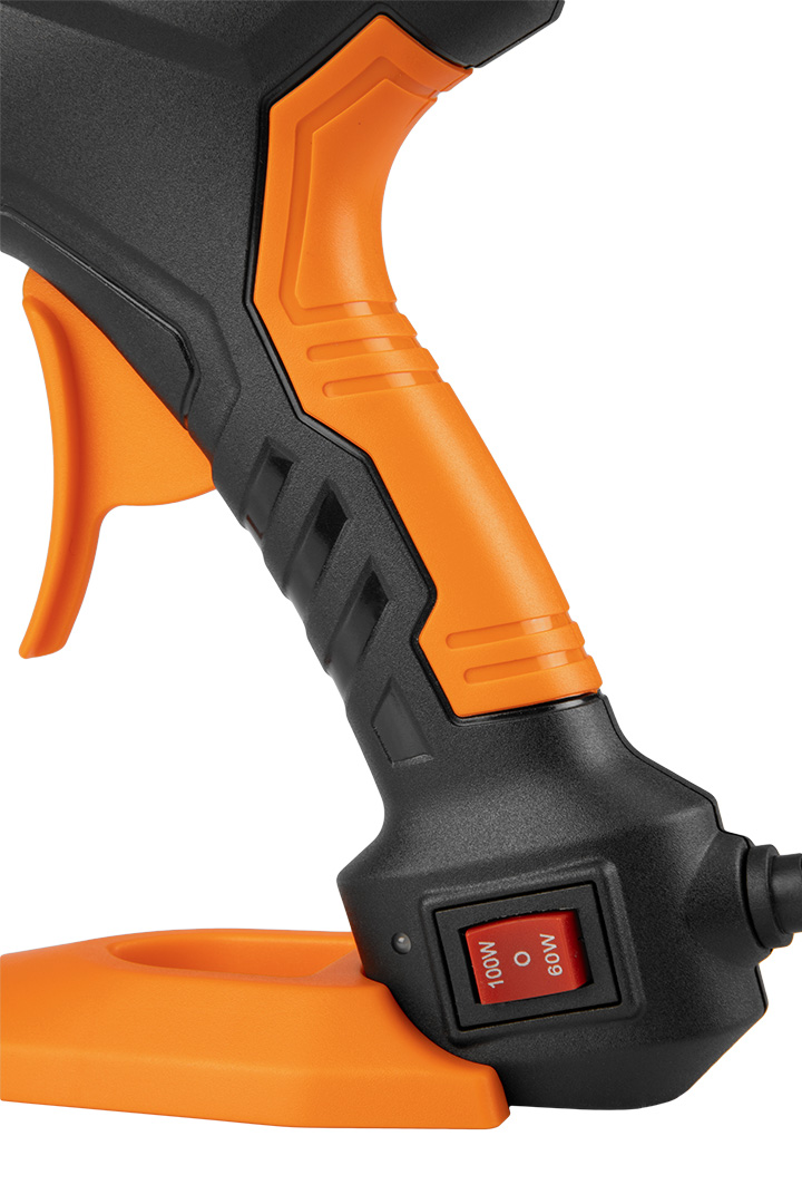Pistolet klejowy o mocy 60 lub 100W. Dostosowany do wkładów 11 mm. Dwie temperatury pracy 120 i 190 stopni Celsjusza. Wyposażony w bezpiecznik, podświetlany wyłącznik i wydajną grzałkę ceramiczną PTC. Dysza miedziana, wymienna, z systemem zapobiegani