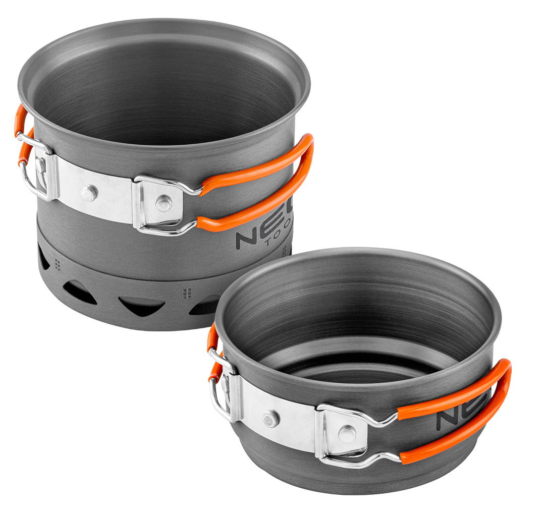 Zestaw garnków 2 w 1 garnek z radiatorem +30% mocy i patelnia, pojemność garnka 0.9l, pojemność patelni 0.5l, wymiar garnka średnica 132mm, wysokość 100mm, wymiar patelni średnica 125mm, wysokość 60mm, torba podróżna, uchwyt składany, izolowany, waga