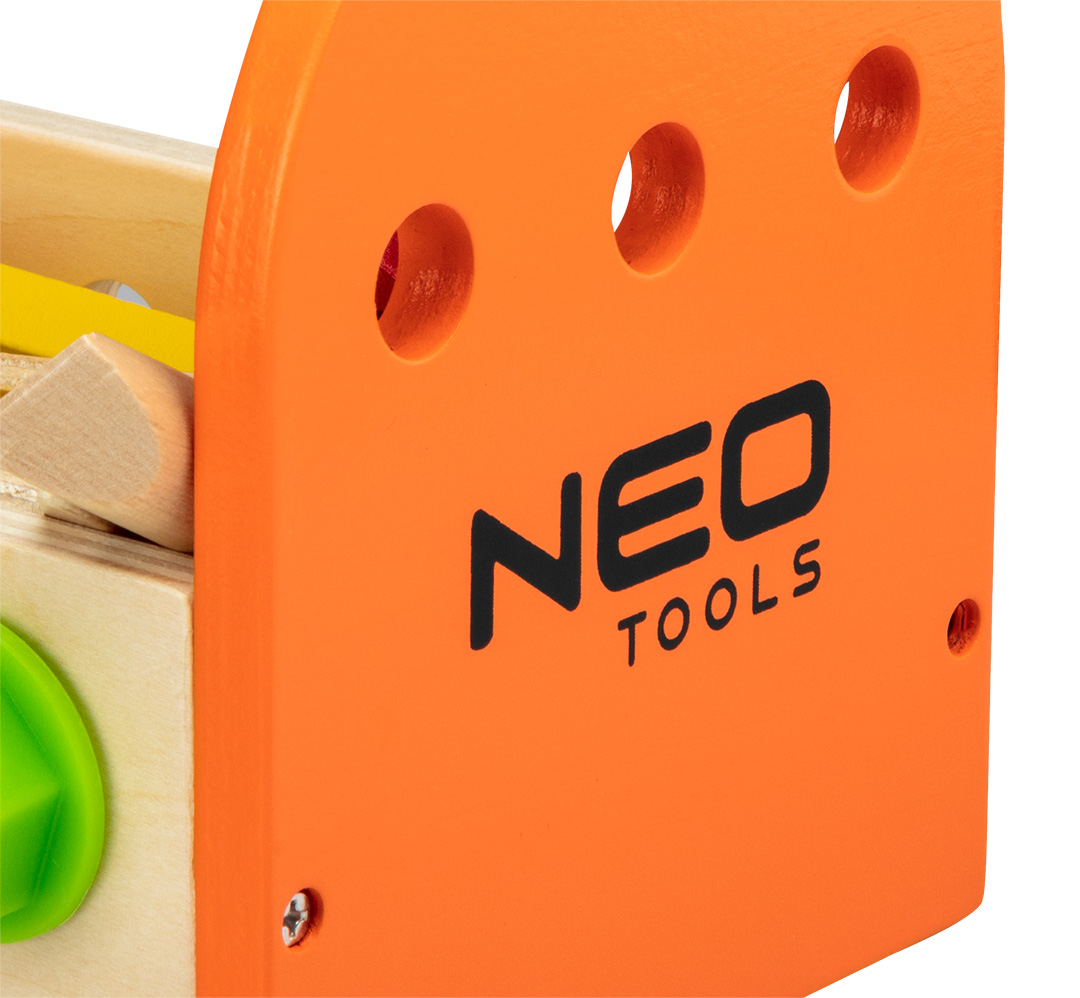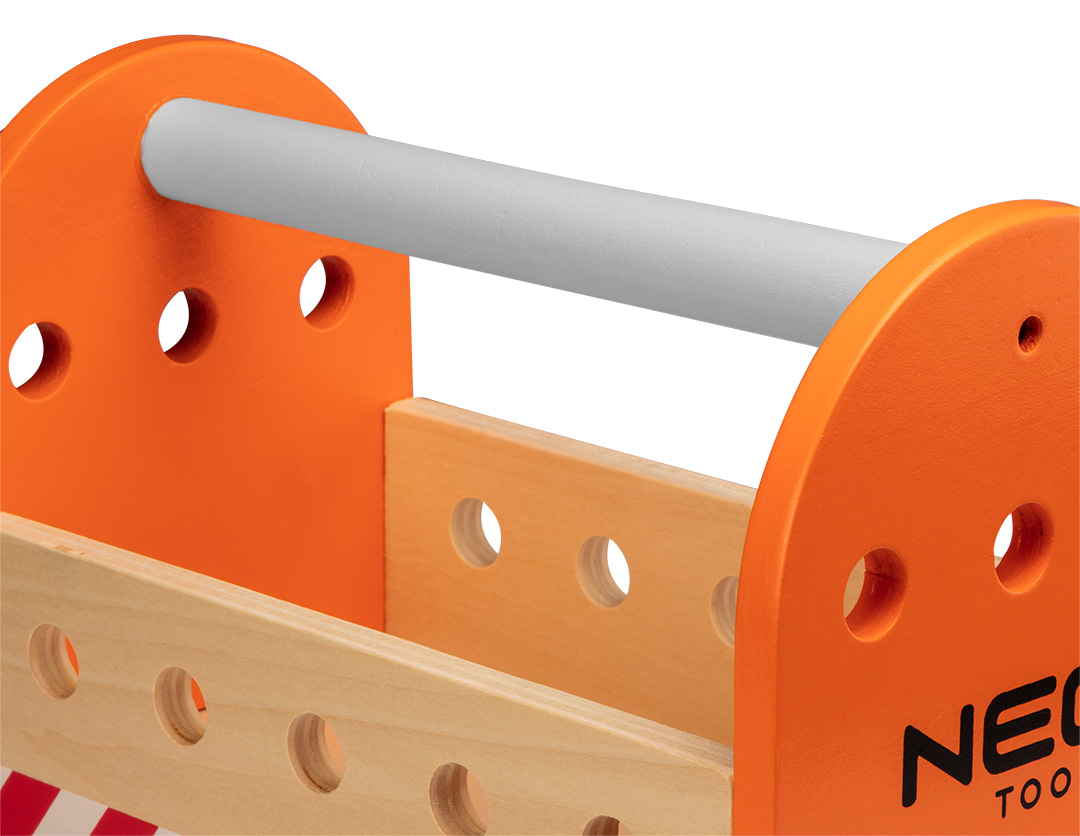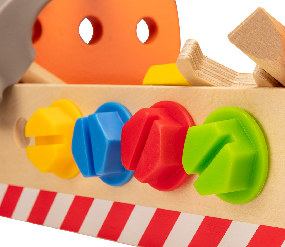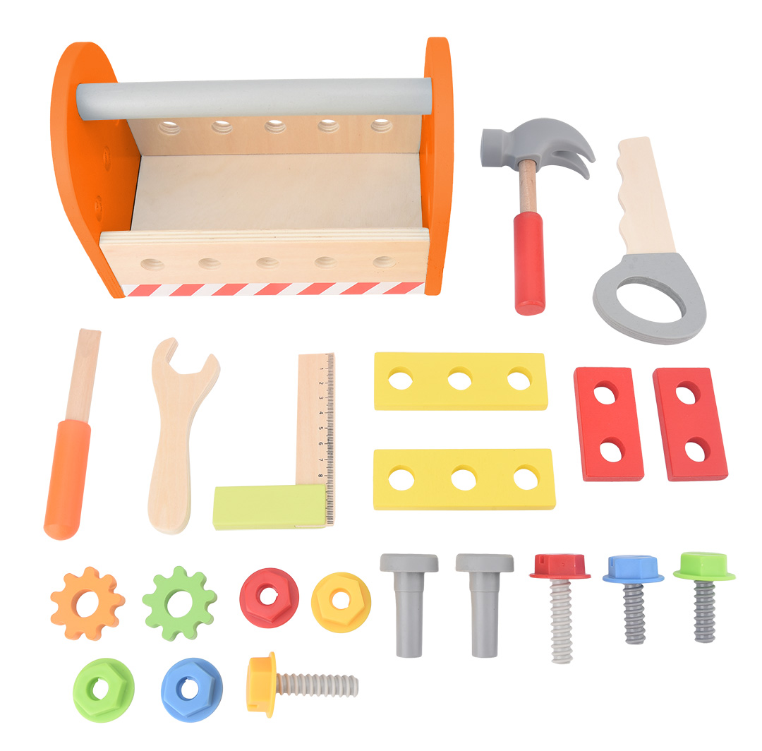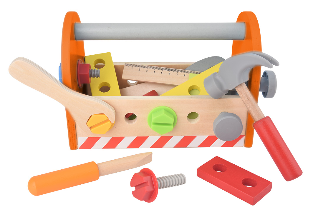 Zestaw narzędzi drewnianych dla dzieci, przeznaczony dla dzieci powyżej 3 roku życia, w zestawie: skrzynka na narzędzia, piła, klucz płaski, 2 listwy, kątownik, młotek, wkrętak płaski, 2 nity, 2 koła zębate, 4 wkręty, 4 nakrętki, waga: 620g, certyfik