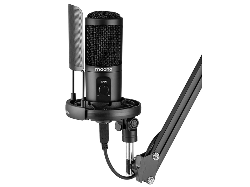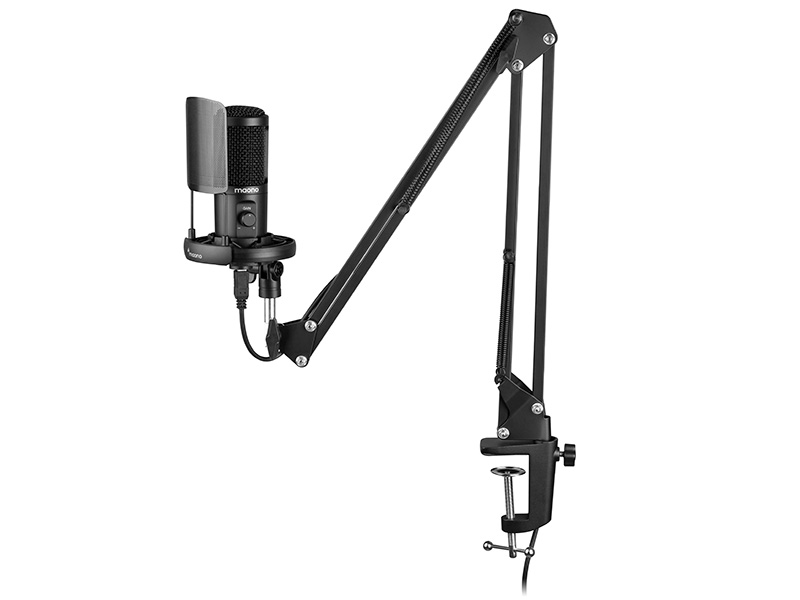 Mikrofon pojemnościowy MAONO na statywieMAONO to mikrofon pojemnościowy o klasycznym designie. Zamocowany na regulowanym statywie montowanym do blatu na zacisk. Wysoka jakość dźwięku, solidna konstrukcja i redukcja szumów to główne zalety mikrofonu.